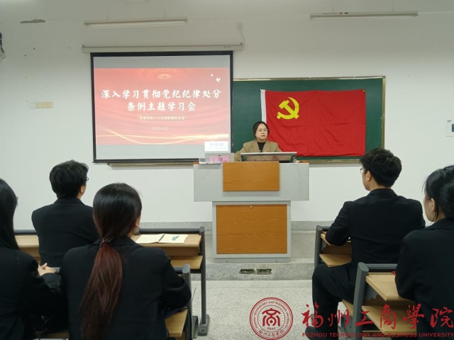 为深入贯彻落实全面从严治党要求,进一步提升支部党员的纪律意识和规矩意识,4月25日,betway88西汉姆联人力资源管理党支部在教学楼C306召开“深入学习贯彻党纪纪律处分条例”主题学习会,本次会议由支部书记李灵娇主持,全体党员参会。