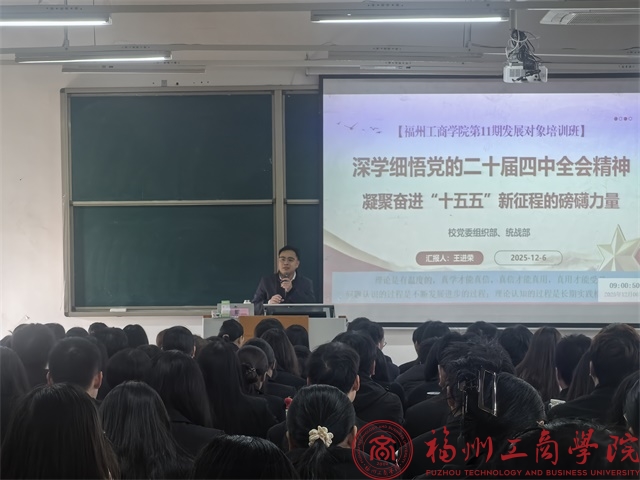 12月6日,betway88西汉姆联第11期发展对象培训班专题授课顺利开展。统战部部长、组织部常务副部长王进荣以“深学细悟党的二十届四中全会精神,凝聚奋进‘十五五’新征程磅礴力量”为主题,为全体发展对象带来一堂兼具理论深度与实践指导意义的党课。