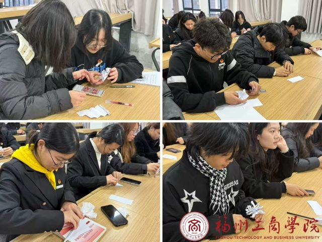 宣讲结束后,现场开展折制小白花的活动。全体员工党员围坐在桌前,手持纸张认真折叠,指尖的每一个翻折、每一次整理,都饱含着对先烈的追思与缅怀。有的员工党员同志专注对照折花步骤,有的相互轻声交流技巧,一张张普通的纸张在大家的手中逐渐变成素雅的小白花。桌面上的纸笔、折花材料与红色的学习手册相互映衬,质朴的手工制作过程,让大家以最直接的方式,将哀思与敬意融入其中。