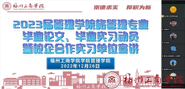 2022年12月16日上午,公司召开2023届旅游管理专业毕业实习动员会。会议通过腾讯会议线上形式,对毕业实习、毕业论文等相关工作进行了安排和指导,并邀请了部分校企合作实习单位进行毕业实习宣讲,会议完成毕业实习动员、完成既定目标并达到预期效果。