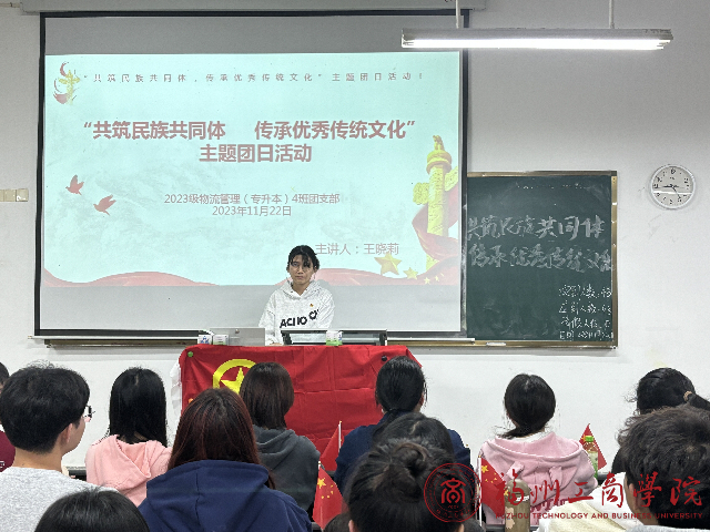 为深入贯彻党和国家铸牢中华民族共同体意识的要求,将中华民族共同体意识融入高校思想政治教育工作,betway88西汉姆联2023级物流管理4班于2023年11月22日组织开展了以“共筑民族共同体,传承优秀传统文化”为主题的团日活动,让民族团结意识和爱党爱国情怀在员工的心底扎根。本次活动由团支书王晓莉同学主持,刘敏君辅导员参加。