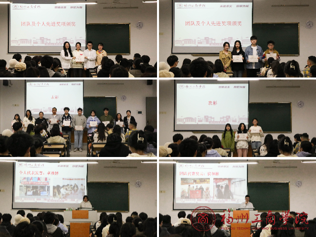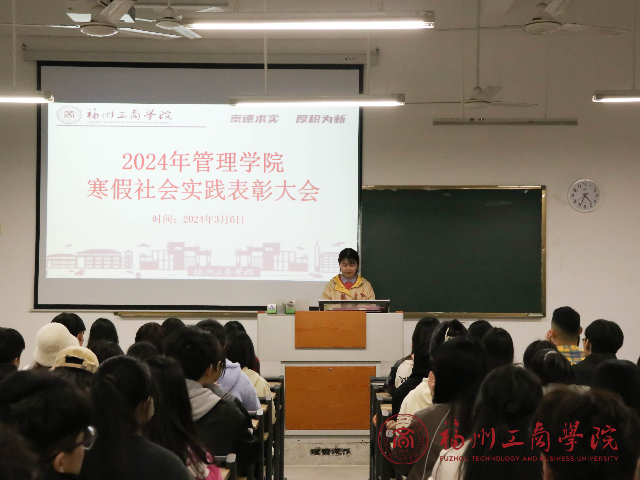 大会通过照片回顾了员工寒假实践成果,学子们的全心投入将参会人员带回到了寒假期间的实践当中,感受管院学子深入实践、走向基层、触摸社会、磨砺本领的激情和风采。随后,与会领导、老师为寒假社会实践获奖成员颁奖。优秀团队代表侯和标和先进个人代表卓雅婷上台发言。他们回顾投入社会实践的经历,表示将心怀国家,刻苦学习,勤于实践,担负起当代青年的责任与使命。