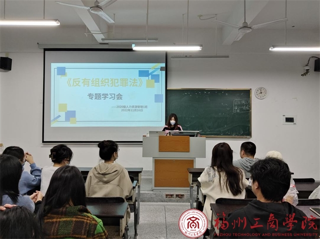 为进一步普及宣传《中华人民共和国反有组织犯罪法》,提高预防有组织犯罪意识,进一步强化校园安全和谐稳定,11月16日晚上,2020级人力资源管理1班开展了《反有组织犯罪法》专题学习会。