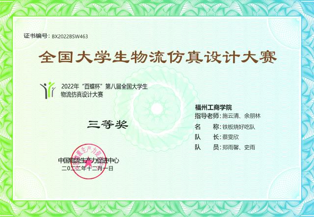 公司公司教师施云清、余朋林指导的参赛团队“铁板烧好吃队”(团队成员:蔡雯欣、郑雨馨、史雨)荣获本科组三等奖,施云清、余朋林老师获得“优秀指导老师”称号。